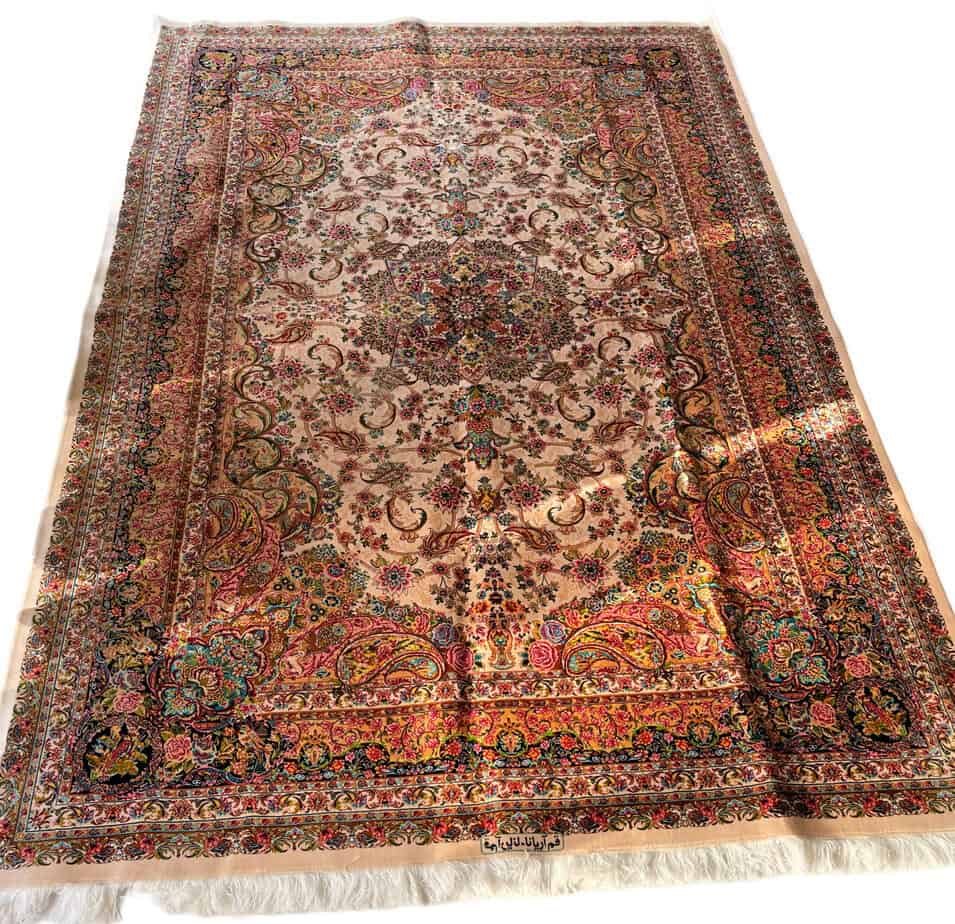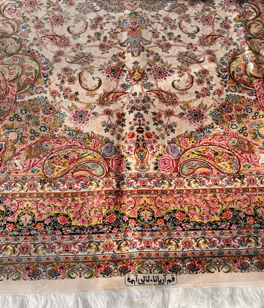 Immerse yourself in the magic of Middle Eastern artistry with our 100% silk Persian rug sourced from Qum, Iran. Boasting rich and complex patterns that are synonymous with Persian craftsmanship, this rug tells a story and also features the makers mark woven at the base of the rug. Each weave reveals a beautiful blend of floral motifs intertwined with wildlife, captured in stunning shades of cream, pink, blue, and green. The rug’s ethereal quality is highlighted by its silk threads, creating a visual spectacle as it appears light or dark depending on the viewing angle. It is an authentic piece of art that will transform any room into a mesmerizing spectacle of cultural history. Measuring 150cm x 225cm, the rug is a versatile size that can enhance both large and small spaces. Owning this rug is more than just a purchase—it’s an experience, a journey into an ancient world where every thread narrates a tale.