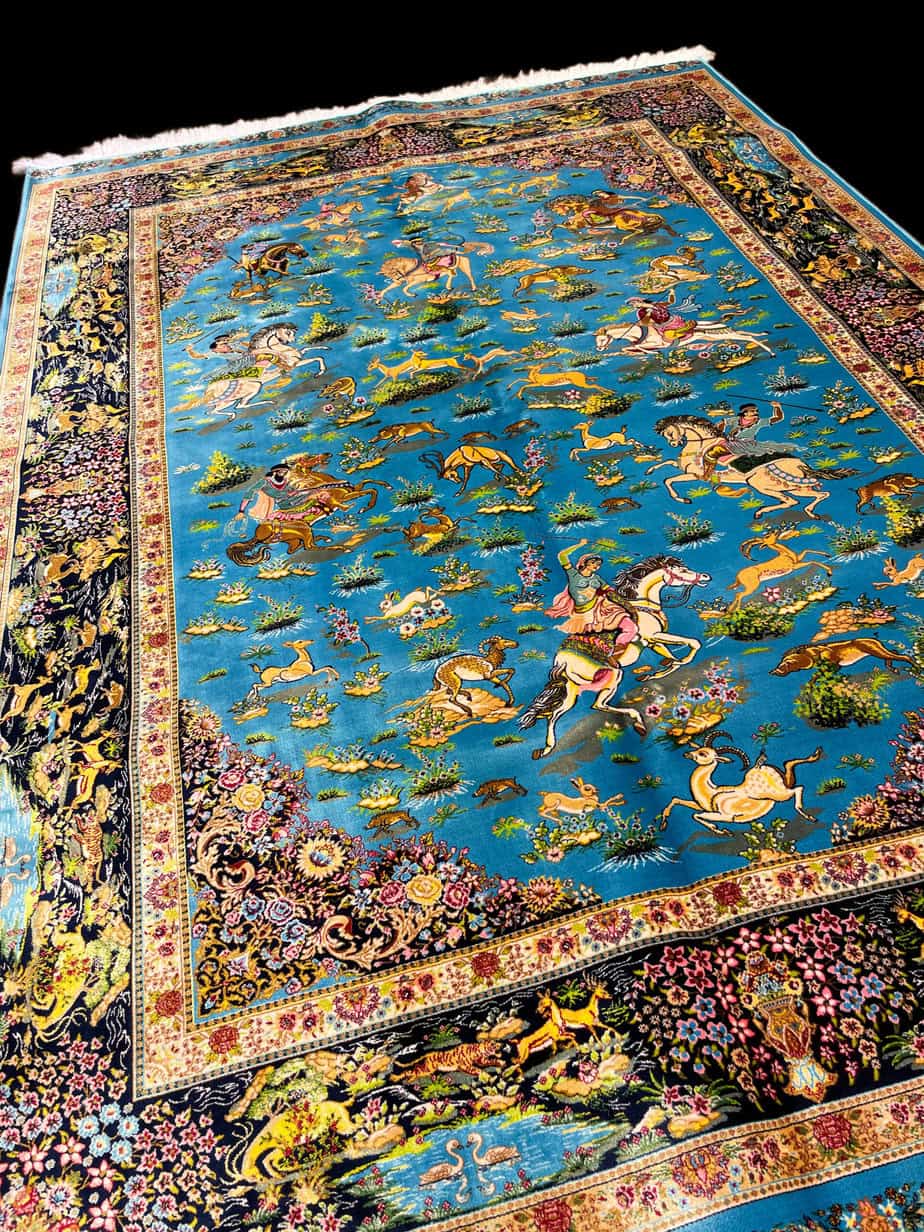 Experience luxury and grandeur with our 100% Silk Persian Rug. Each rug comes from the heart of Iran, the city of Qom, known for its master artisans who create these magnificent pieces of art. The centrepiece of this rug depicts a hunting scene, intricate floral patterns as well as local wildlife offering a unique blend of tradition and allure. As if the scene comes alive, the surrounding wildlife and flourishing florals breathe life and elegance into your living space. The makers mark is also woven into the border of the rug. The main colour of the rug is sky blue. The dimensions are 225 x 150 cm, offering a generous area to enhance the ambiance of any room. Larger sizes and runners are also available, promising a perfect fit for your home. Every element of this rug is a testament to the incredible craftsmanship of Persian artisans. The 100% silk material makes it an epitome of luxury, ensuring the most satisfying touch every time you step on it. This Silk Persian Rug isn’t merely a rug; it’s an heirloom, telling tales of the rich Iranian flora and fauna with its stunning design. Contact us for additional size options.