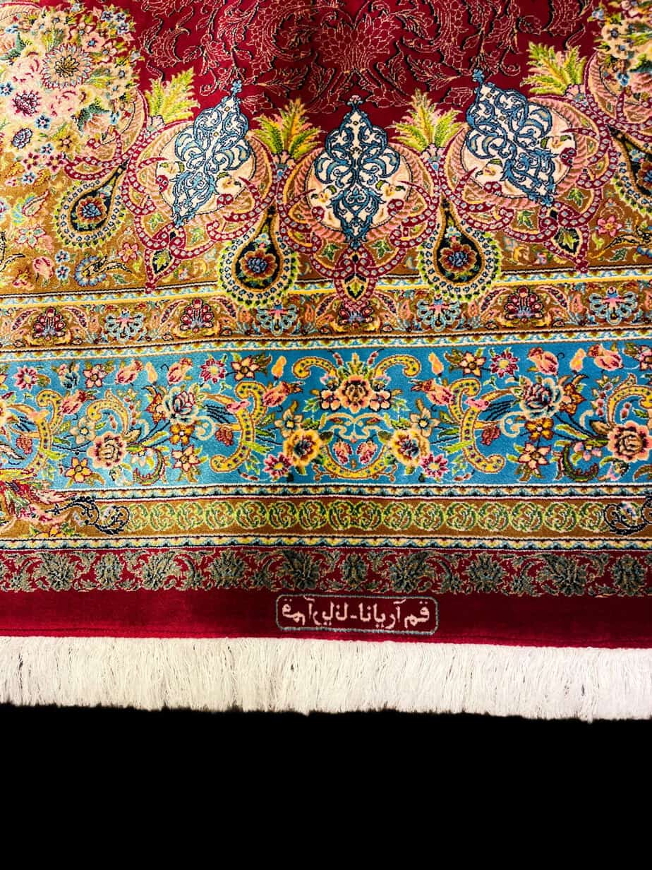 100% Silk Persian Rug from Qom – Deep Red with Intricate Floral & Geometric Motifs