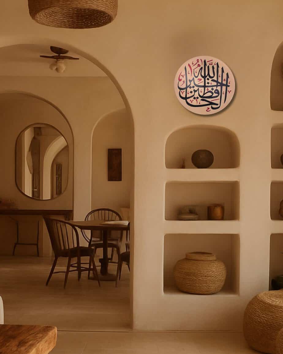 Immerse yourself in the beauty of cultural art with our 12″ wall art pottery plate adorned with Arabic Calligraphy. Crafted from natural clay, this compelling piece offers a unique blend of authenticity and creativity, ideal for anyone who appreciates the rich essence of Arabian art. The focal point of the plate is the intricate Arabic Calligraphy that translates to ‘God is the best of Protectors‘, hand-painted by skilled artisans in a decorative script. The contrasting shades of black and red against the natural clay background provide an aesthetically pleasing visual depth to the piece. This pottery plate comes with an embedded hook for effortless wall mounting, transforming any blank wall into an artistic statement. This stunning piece of wall decor embodies the spirit of Arabian art and serves as a constant reminder of the powerful message it carries.