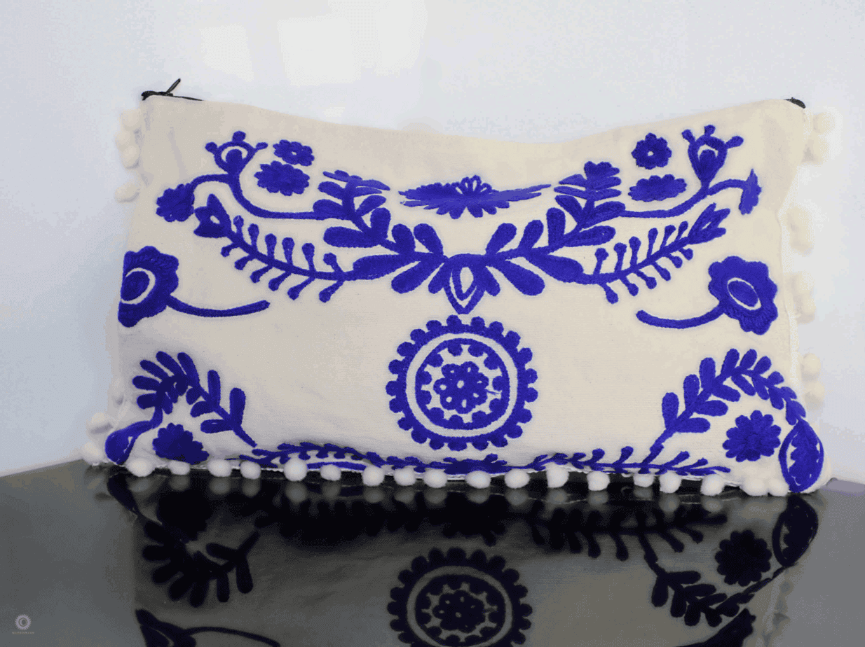 Our cream canvas boho clutch bag is hand embroidered with royal blue stitching and has cream trim. This boho clutch will add a splash of colour to jeans and a white T-shirt or summer dress. Simple but colourful clutch.