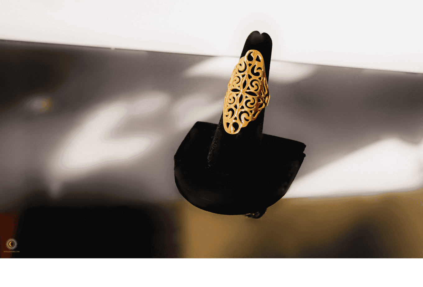 Inspired by the intricate carved designs found in Bahrain pottery, we created the Dilmun ring. This show-stopper is a true statement ring. This ring is long and stretches to your knuckle and is made in 18K gold. Watch the admiring glances when you wear this unique piece. The ring displayed is size 16 (US 7.5). Please note if this ring is not available in your size, we will custom make a piece for you, please allow 2 to 3 weeks as these rings are handmade in-house.