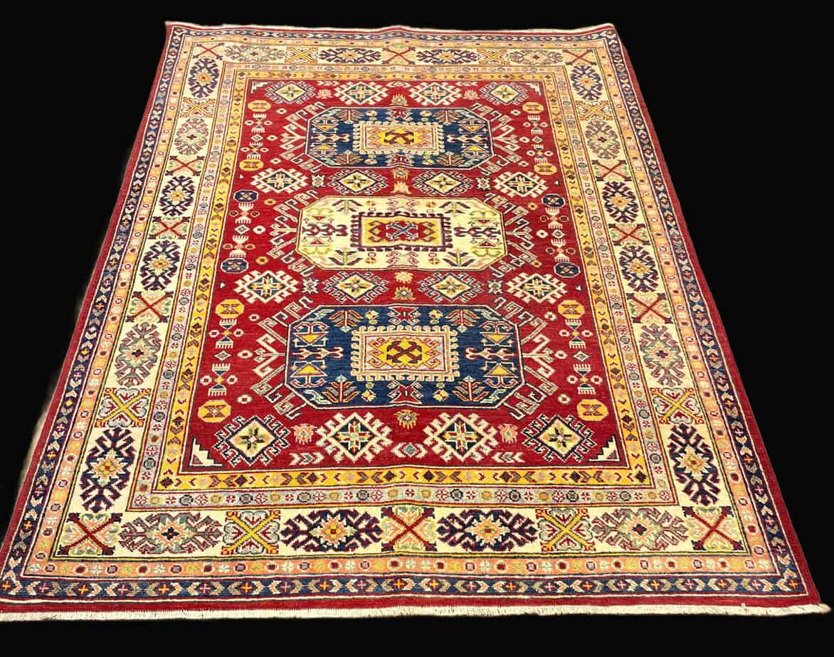 Intricately handcrafted, this exquisite Hand-Knotted Tribal Kazak Rug from Afghanistan is a celebration of artistic tradition and exceptional craftsmanship. This piece embodies the fusion of tribal motifs and bold geometric patterns that add depth and richness to any room. Each knot, medallion, cross, and star is individually hand-knotted, paying tribute to generations-old artistic traditions. The rug is made from handspun wool, producing an organic texture which has remarkable durability that surpasses machine-made rugs. The naturally vibrant colors are the result of using 100% natural dyes derived from nature’s palette, underlining its unique and authentic character. This rug doesn’t simply fill a space, but transforms it into an area of warmth and inviting charm. Measuring 197 x 148cm, this Kazak rug is an excellent addition to your home decor, adding a touch of Afghan culture and artistry to your spaces.
