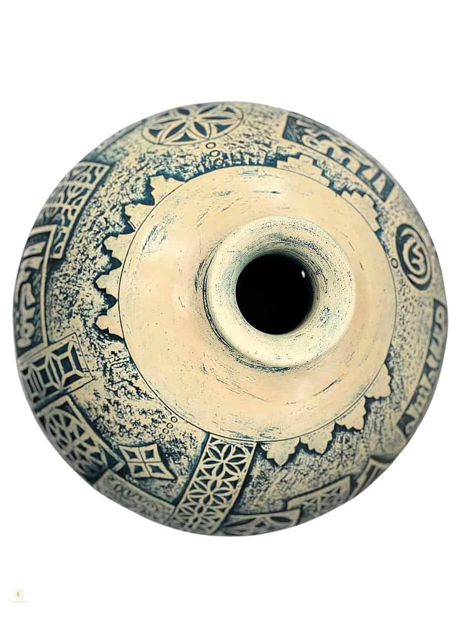 This wonderful clay pot is embellished with Arabic patterns and Arabic Calligraphy which translates to “Thanks to God“. The calligraphy and engraving is overlayed with a light blue stain to best display the fine detail. Bahrain Pottery is created entirely by hand. All photos are taken in natural daylight to provide a true depiction of our products.